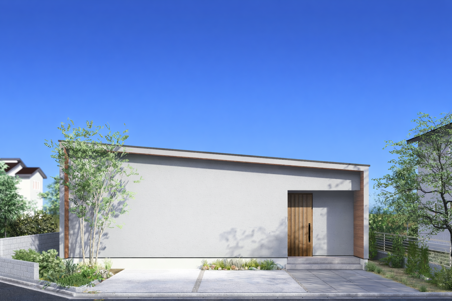 片流れの屋根に暗めのグレーの塗り壁がかっこいいお家